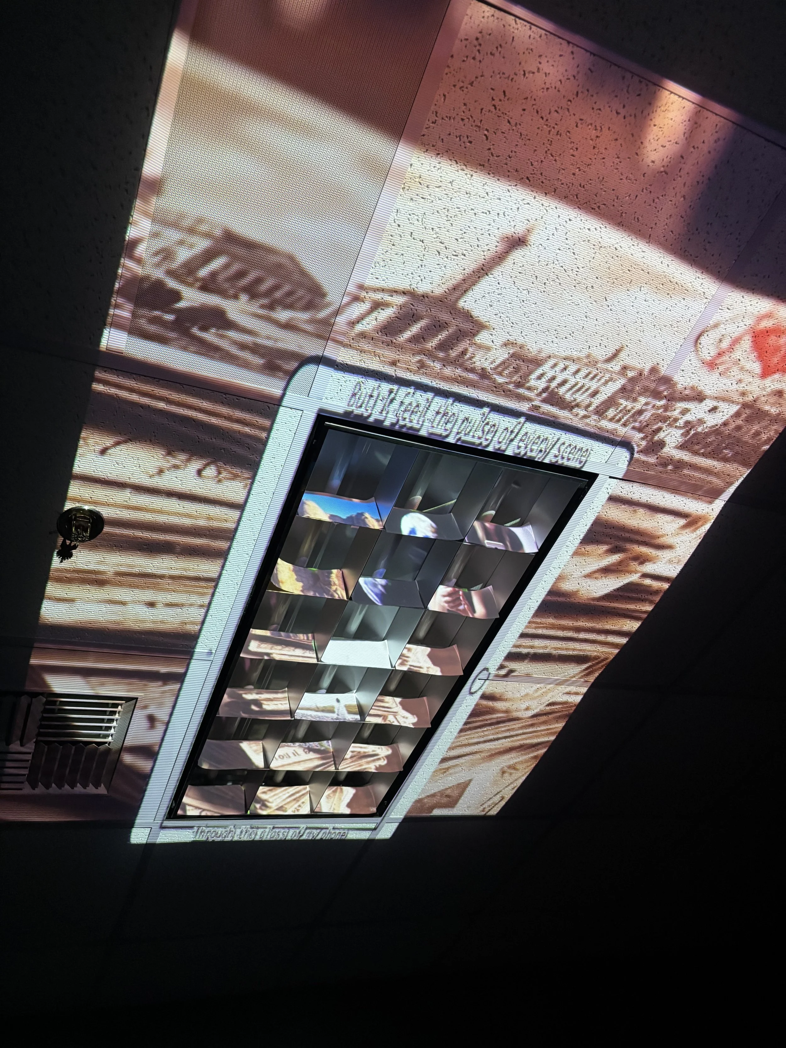 Physical Masking & Mapping: To create the iPad effect on the ceiling, I used white poster board to create high-contrast projection surfaces while allowing reflections off the surrounding glass to mimic the glow of a tablet screen.