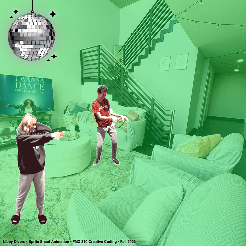 I Wanna Dance With Somebody is an interactive digital performance that transforms real-world movement into a retro 8-bit game aesthetic. By repurposing traditional photo-editing and web-development tools for character animation, I created a dynamic dorm-room dance party where the user’s cursor acts as a spotlight, triggering animated sequences across a multi-layered canvas.