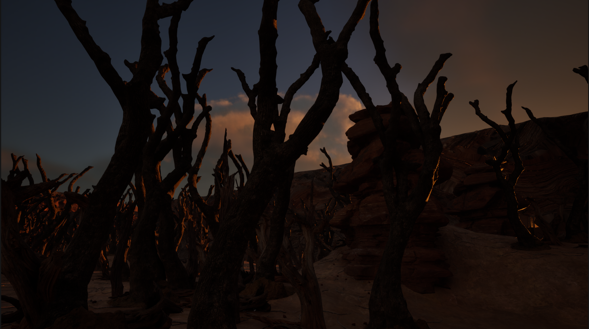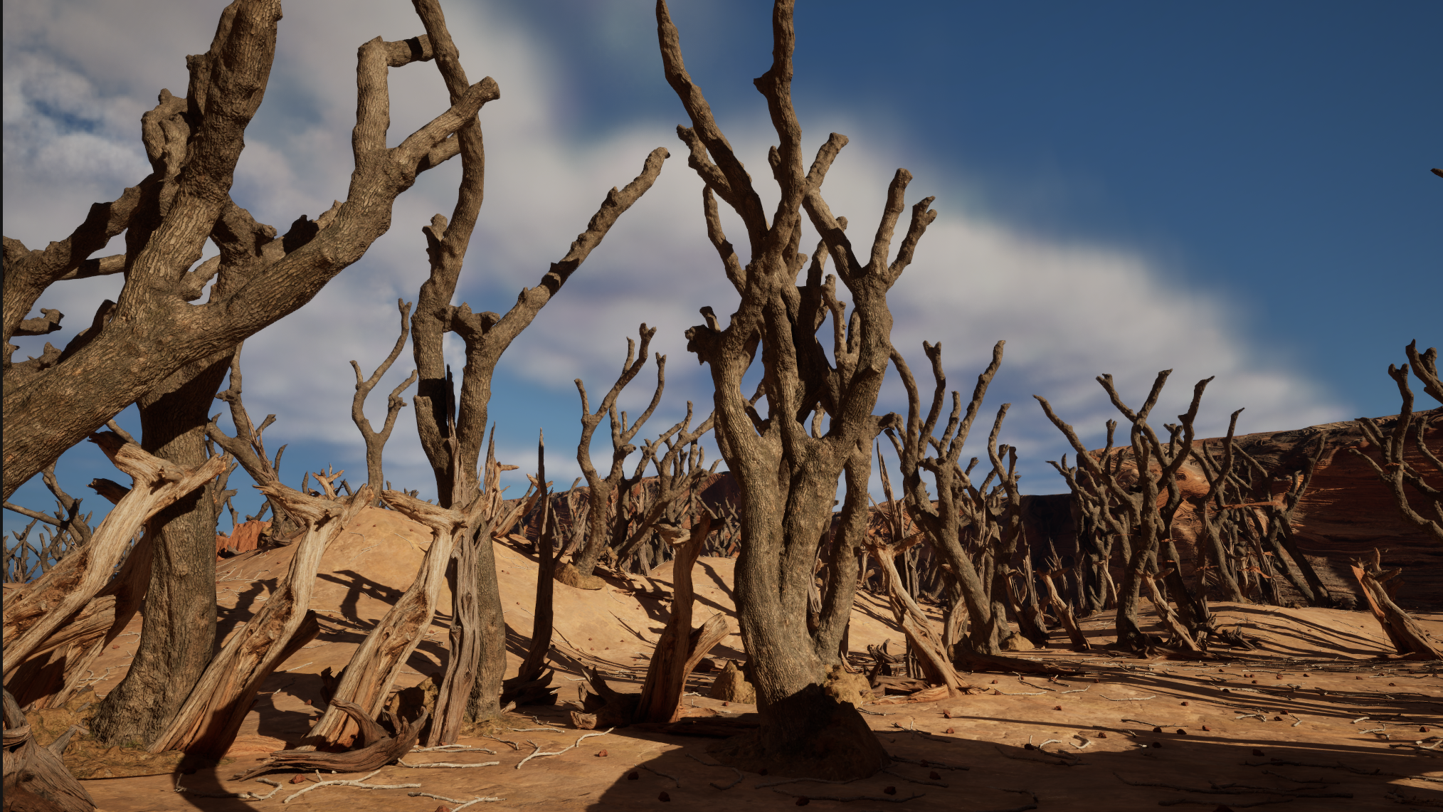 The goal of this project was to demonstrate advanced technical skills in Unreal Engine by expanding on a foundational immersive assignment. I aimed to create a forest-in-the-desert aesthetic, balancing the starkness of a desert landscape with detailed organic elements to maximize player immersion.